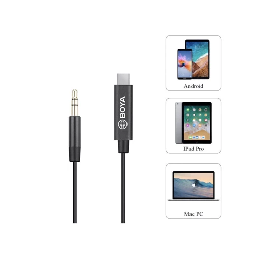 Универсальный адаптер Boya BY-K2 Type-C на 3.5 мм TRS — это переходник, который используется для подключения микрофонов, оборудованных съемным кабелем, или беспроводных микрофонов к планшету или телефону работающего на операционной системе Android или iOS. На одной стороне 20-ти сантиметрового кабеля расположен штекер 3,5 мм (TRS), а на другой - USB Type-C.