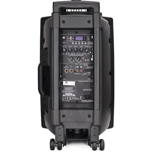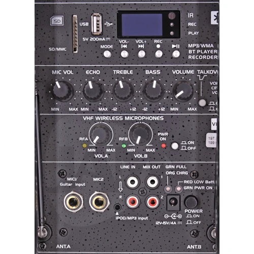 Акустическая система активна, со встроенным медиаплеером USB/SD card, Bluetooth и двумя ручными микрофонами (VHF диапазон)