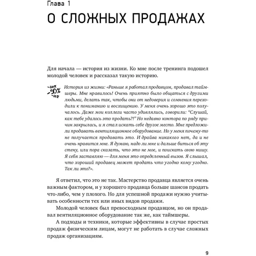 Сложные продажи — длительный и многоступенчатый процесс, который требует терпения и мастерства. Умеете ли вы выстраивать стратегию сложной продажи? Насколько эффективно вы ищете и привлекаете клиентов? Какие вопросы вы используете, чтобы заинтересовать их? Насколько успешно вы ведете переговоры о цене? Андрей Анучин,опытный продавец, бизнес-тренер и сертифицированный преподаватель Института Адизеса, буквально по полочкам раскладывает разные правила и техники продаж в своей книге. Структурированный теоретический материал, подкрепленный примерами и историями из жизни мастера своего дела, — вот в чем особенность «Простой книги о сложных продажах».
