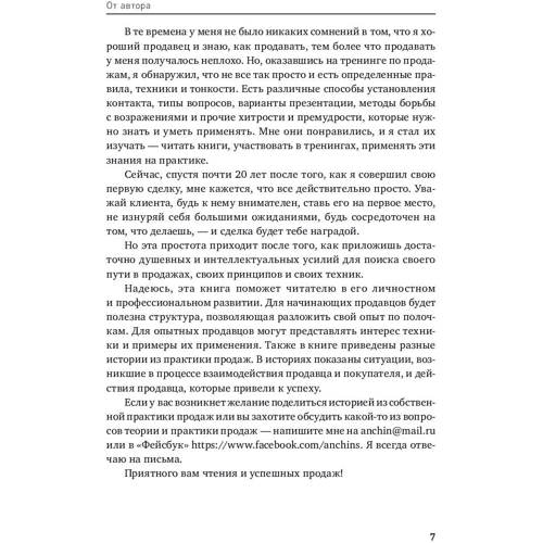 Андрей Анучин предлагает посмотреть на мир продаж своими глазами. Глазами человека, пришедшего в данную область из далекой от этого радиофизики. Что доказывает становящийсяаксиомой факт: продажам можно и нужно учиться! Интересные примеры и техники продаж, поучительные жизненные истории и, главное, успешный опыт — это то, что встречается на протяжении недолгих, но весьма содержательных ста страниц. При этом автор настаивает на том, что невозможно применить все методики сразу и одновременно, надо выбрать из них те, которые наиболее соответствуют характеру продавца и намерению покупателя. «В недавней советской истории профессия продавца была, мягко говоря, не очень уважаемой. Слова „спекулянт“ и „барыга“ до сихпор остаются в нашем лексиконе. Поэтому кредит доверия у продавцов невелик, что часто не позволяет свободно задавать вопросы покупателю», — заключает он.