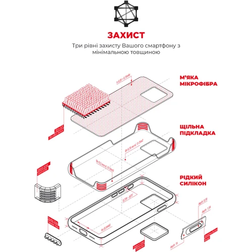 При изготовлении чехла использовались премиальные материалы - Liquid silicone, c Soft Touch покрытием. Мягкая подкладка из премиальной микрофибры надежно защитит ваш гаджет от царапин, грязи и пыли. Чехол снабжен ребрами жесткости, таким образом телефон защищён со всех сторон. Дополнительным преимуществом есть наличие выступающих бортов над дисплеем и наличие дополнительной пластикой рамки над задней камеры для дополнительной защиты. В панели предусмотрены все необходимые вырезы и кнопки. Так же аксессуар не мешает использованию портов и интерфейсов устройства.