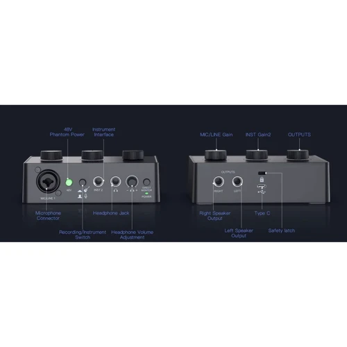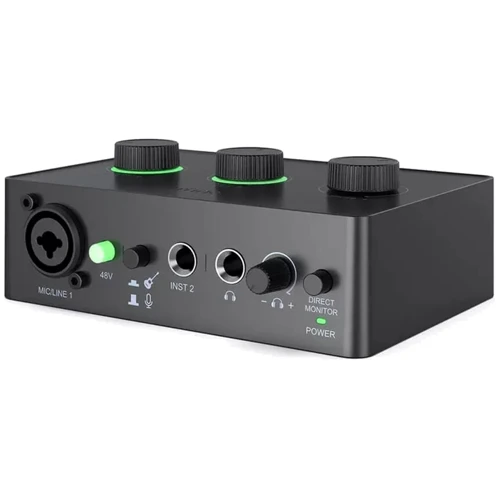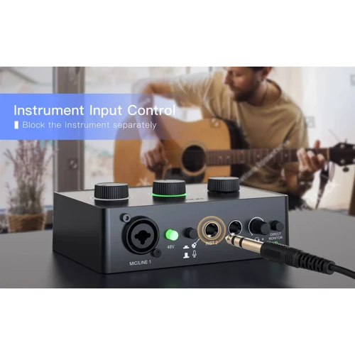 XLR и 6.35-мм разъем с фантомным питанием 48 В: Эта звуковая карта совместима с динамическими и конденсаторными микрофонами благодаря наличию XLR и 6.35-мм разъема с фантомным питанием 48 В. Это позволяет подключать разные типы микрофонов для обеспечения большей гибкости в работе.