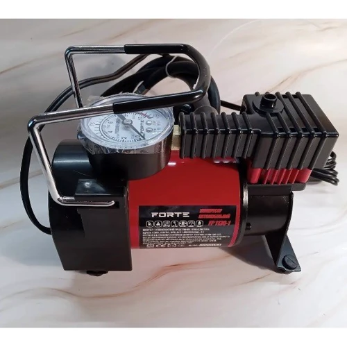 Автомобильный компрессор Forte FP 1130-1 предназначен для быстрой закачки шин автомобилей, велосипедов, мопедов и различных развлекательных, спортивных предметов (мячей, кругов, лодок). Главным преимуществом компрессора является металлический поршень и шатун с уплотнительным тефлоновым кольцом. Корпус компрессора изготовлен из металла, благодаря чему быстро и эффективно рассеивает тепло от электродвигателя во время работы. Компрессор оборудован аналоговым манометром.