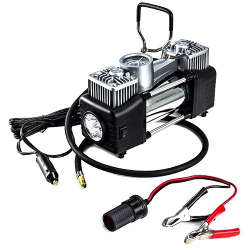 Модель укомплектована воздушным шлангом, переходником для подключения к АКБ автомобиля, набором аксессуаров, манометром для контроля давления, LED фонариком и удобной усиленной сумкой для хранения и транспортировки компрессора.