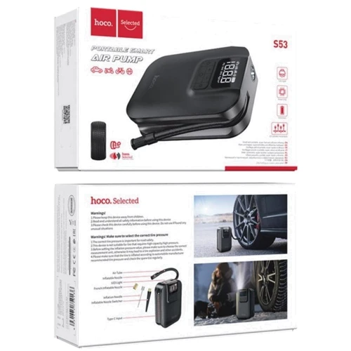 Электрический насос для автомобиля HOCO Breeze Portable Smart Air Pump S53 является простым и функциональным устройством, которое необходимо иметь каждому автомобилисту в багажнике. Посредством компрессора Hoco можно не только быстро накачать колесо легкового автомобиля или внедорожника, но и быстро отремонтировать проколотую шину. Его также можно использовать ночью, потому что есть фонарик, который прекрасно освещает рабочую зону. Цельнометаллический корпус такого же размера, как мобильный телефон, и размещается в автомобиле, не занимая много места. На корпусе компрессора находится дисплей и кнопки управления, контролирующие процесс подкачки колеса. На дисплее отображается точное давление в шинах, а с помощью кнопок можно добавить давление или снизить. В комплекте идут насадки для подкачки мяча, велосипеда и мотоцикла.