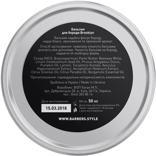 # Свойства бальзама для бороды Brooklyn: надежно укладывает и фиксирует бороду в течение всего дня, защищает от негативного воздействия как мороза, так и ультрафиолетовых лучей, помогает избавиться от шелушей, воспалений и раздражений, не оставляет жирного блеска, Подходит для укладки бороды и усов.