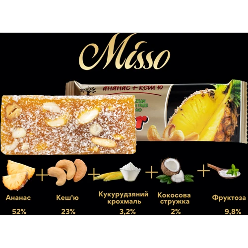 Бережно приготовленные кусочки спелого ананаса и измельченные орехи кешью в новом аппетитном фитбаре от Misso. Густой тропический аромат сладкого ананаса идеально дополнен тонким сливочным вкусом кешью. В деликатно высушенных фруктовых ломтиках сохранены все полезные свойства, в частности ценный энзим бромелайн. Он способствует интенсивному жиросжиганию и здоровому обмену веществ в организме. Высокое содержание магния, цинка и железа в орехах кешью насыщает батончик особой пользой для каждого, кто заботится о своем физическом и ментальном здоровье.