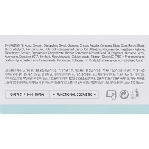 Состав: Aqua, Glycerin, Dipropylene Glycol, Chondrus Crispus Powder, Ceratonia Siliqua Gum, Benzyl Glycol, Butoxydiglycol, Xanthan Gum, PEG-60Hydrogenated Castor Oil, Allantoin, Niacinamide, Raspberry Ketone, Tocopheryl Acetate, Dipotassium Glycyrrhizate, Ricinus Communis (Castor) Seed Oil, Fragrance, Butylene Glycol, Adenosine, Disodium EDTA, Synthetic Fluorphlogopite, Calcium lactate, Titanium Dioxide(CI 77891), Phenoxyethanol, Sodium Hyaluronate, Ferric Ferrocyanide, Hydrolyzed Collagen, Tin Oxide, Ethylhexylglycerin, Hydrolyzed Coral.