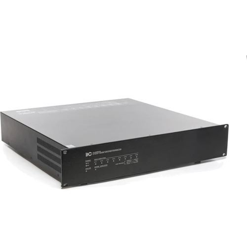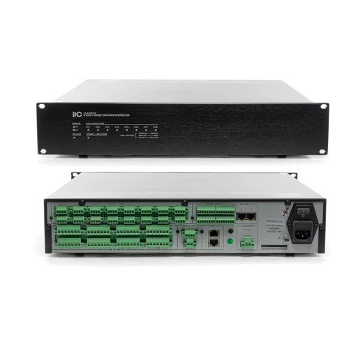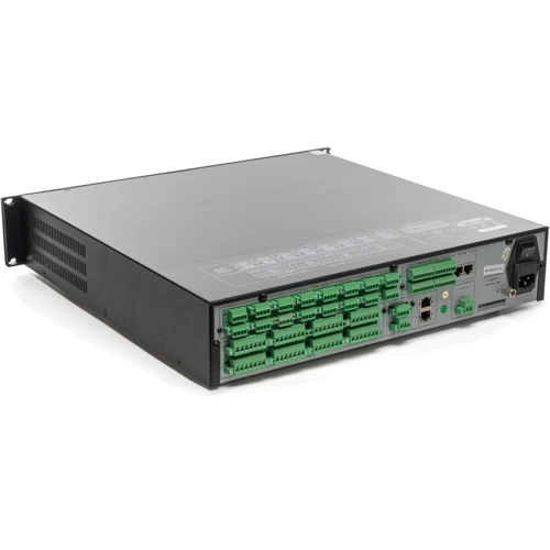 Тильная сторона оснащена разъемами для подключения 8 каналов основных и резервных усилителей, источников аудиосигнала и трансляционных линий 100 В.