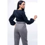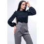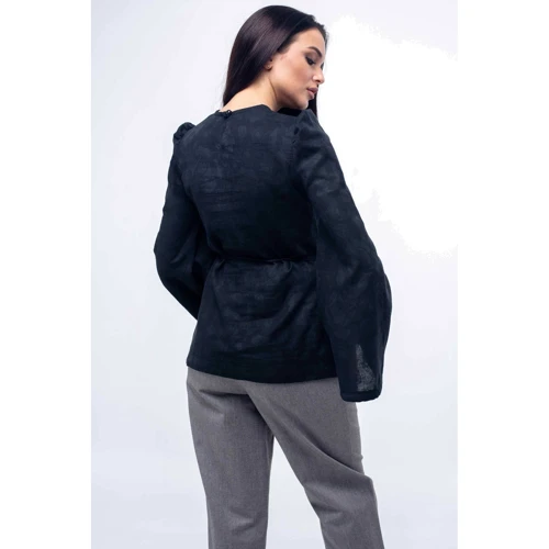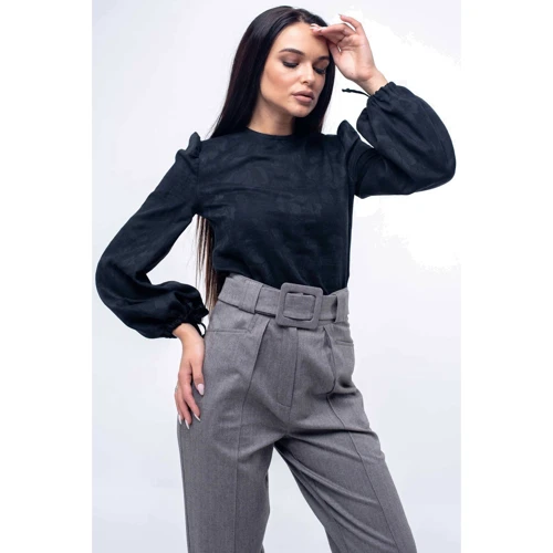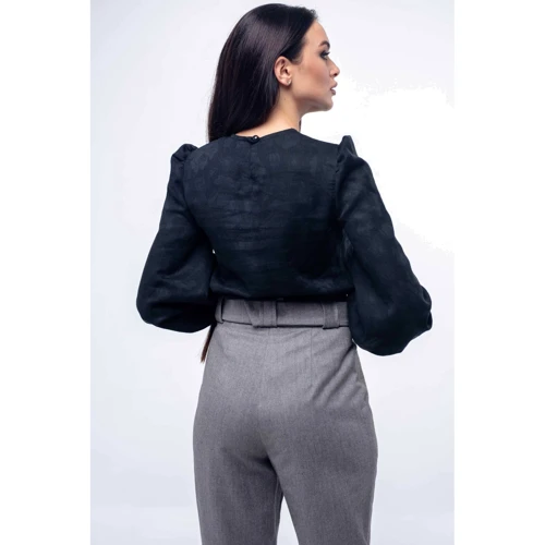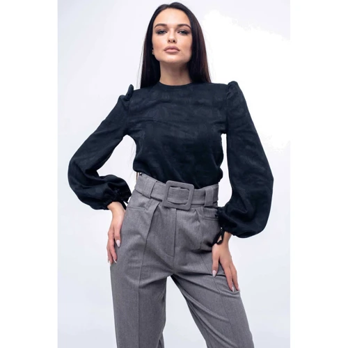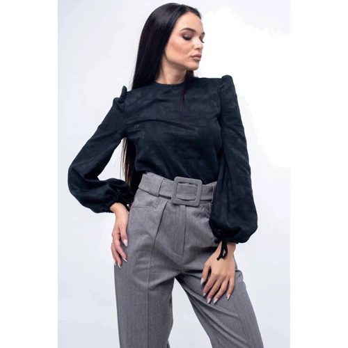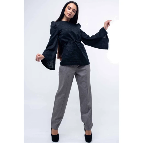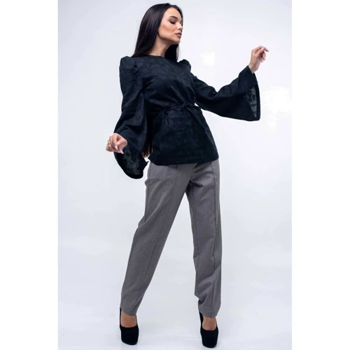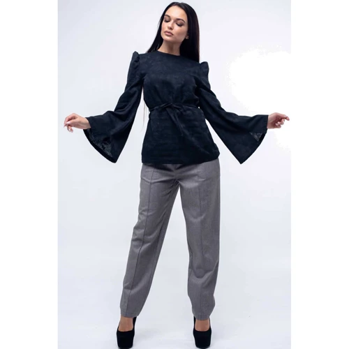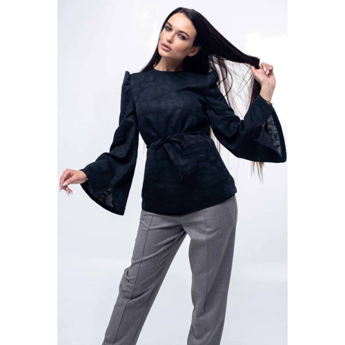 Лаконично-женственная блуза прямого силуэта длиной до линии бедра, с круглой горловиной и со сборкой в верхней части рукава. Спинка блузы имеет средний шов, который у горловины заканчивается разрезом, застегивающимся на пуговицу. Оригинально оформленный низ расклешающегося рукава обработан кулиской в которую продет шнур, позволяющий носить рукав как в широком, так и в собранном виде. Тонкий пояс из основной ткани блузы на уровне талии вдет в две навесные петли.