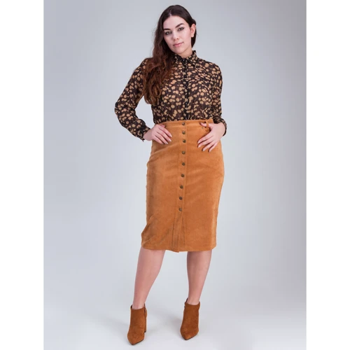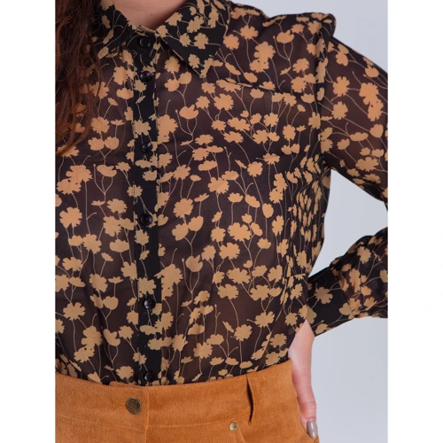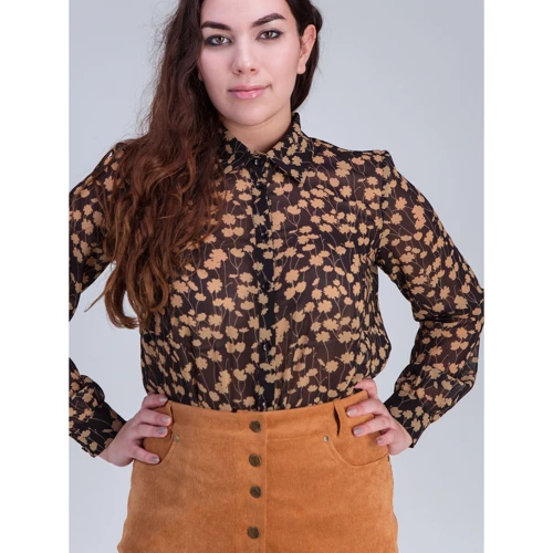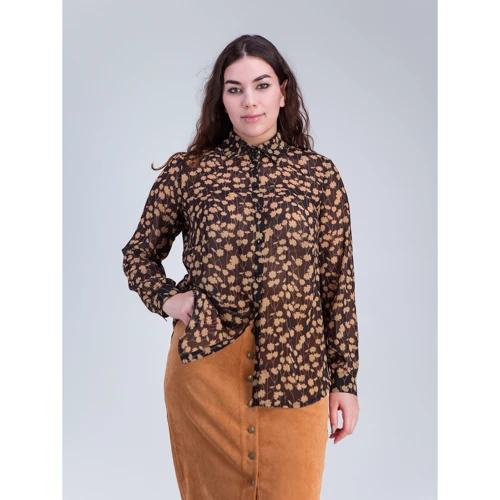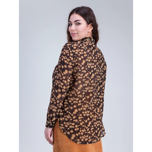 Блуза из принтованного шифона, прямого силуэта. Перед - с центральной застежкой на «петли-пуговицы», без выточек. Спинка - цельнокроенная, рукав - рубашечный в меру свободный, одношовный, длинный с декоративными складами внизу. Манжет рукава - с застежкой на 1 пуговицу. Воротник – стояче-отложной на стойке. Блуза прекрасна в своей комбинации с любого фасона и фактуры юбкой (зауженная, прямая, расклешенная к низу, кожа, костюмная ткань, деним), также как и с брюками различного объема.
