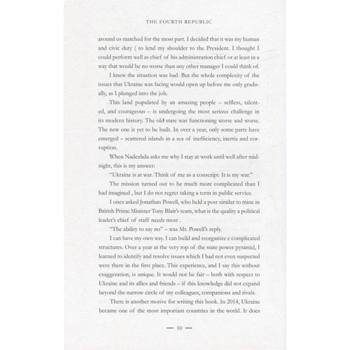 Perhaps twenty years from now, the events that befell Ukraine in 2014-2015 will be perceived not as a set of trials, but as the threshold of a new epoch. One of the key figures of this period - Chief of the Presidential Administration Borys Lozhkin - in this book narrates the story of how the new Ukrainian state - free from the legacy of Soviet power and the domination of oligarchs - was built. The Fourth Republic is a book about Ukraine returning to the European family of nations, about goals accomplished and the goals that lie ahead.