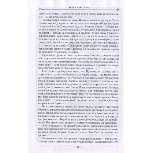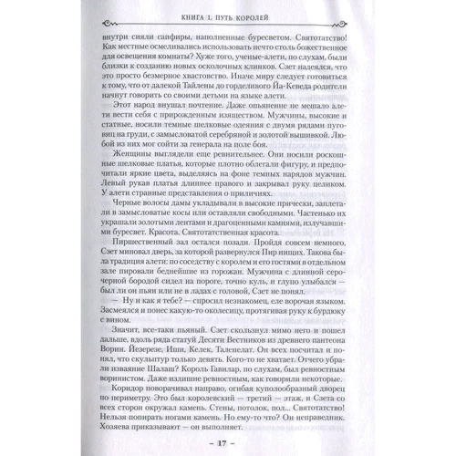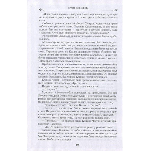 Рошар - мир во власти великих бурь, сметающих все живое на своем пути. Но есть и то, что страшнее любой великой бури, - это истинное опустошение. Одно лишь его ожидание меняет судьбы целых народов. Сумеют ли люди сплотиться перед лицом страшной угрозы? Найдется ли тот, для кого древняя клятва - жизнь прежде смерти, сила прежде слабости, путь прежде цели - станет чем-то большим, нежели просто слова?