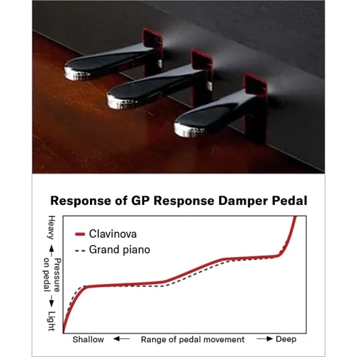 Цифровые пианино Clavinova оснащены демпферной педалью, которая постоянно определяет глубину нажатия и допускает неполное половинное нажатие, что позволяет игрокам вносить мелкие корректировки в нажатие и возврат педали, изменяя глубину и характер звука своего фортепиано.