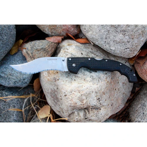 Voyager - одна из самых надежных моделей в ассортименте Cold Steel: во время испытаний ножа этой линейки с клинком 127 мм в раскрытом состоянии он не сложился при нагрузке на рукоятку в 54,45 кг. Благодаря сочетанию надежности и практичности, Voyager можно назвать одним из самых универсальных складных ножей, которые могут изспользоваться как в повседневном использовании, так и в аутдоре. Агрессивный и быстрый рез Vaquero обеспечивается «S»-образной формой клинка, спусками от обуха и серрейторной заточкой. Такой набор преимуществ позволяет легко резать традиционно трудноразрезаемые материалы: пеньковые канаты, кожу, ремни и т.д.