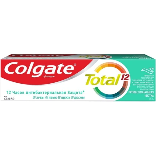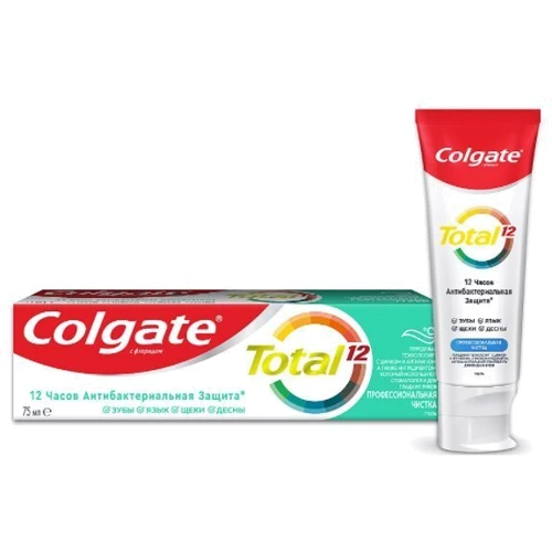 Colgate Total 12 Профессиональная чистка (гель) ежедневно обеспечивает превосходную защиту от налета, признаков воспаления десен при борьбе с бактериями, нейтрализацию неприятного запаха изо рта, защиту от разрушения эмали, повышенной чувствительности зубов, кариеса, налета, зубного камня, потемнений на эмали и проблем с деснами.