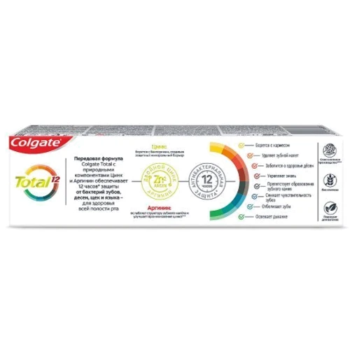 Революционная формула Colgate Total борется с бактериями создавая минеральный барьер на зубах, языке, щеках и деснах и защищает их на протяжении 12 часов.