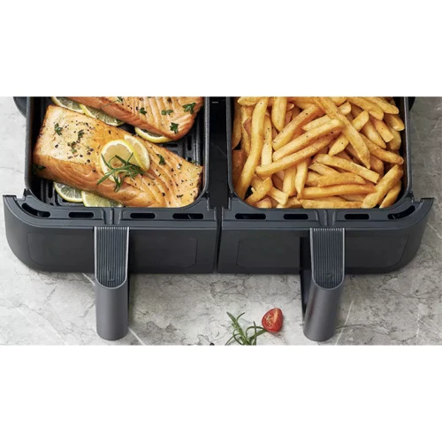 Две зоны по 4.25 л сэкономят ваше время. Не беспокойтесь о перемешивании ароматов, корзины изолированы. Их можно настроить отдельно, чтобы в одной жарить картошку фри, а во второй грилировать курицу. Также есть функция синхронизации, чтобы вы не хорошо организовали подачу и получили два различных блюда, которые будут готовы одновременно.