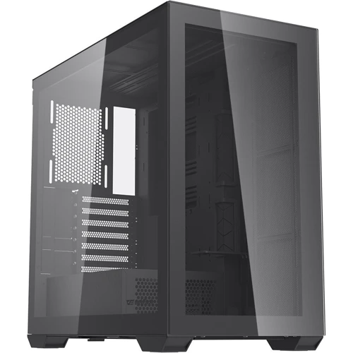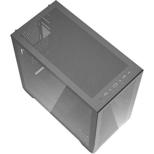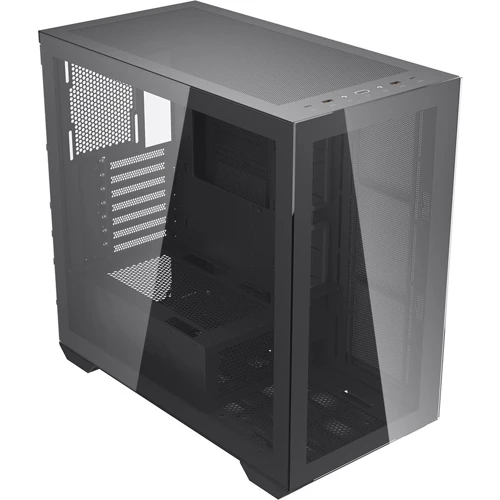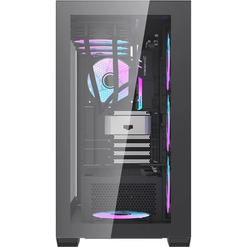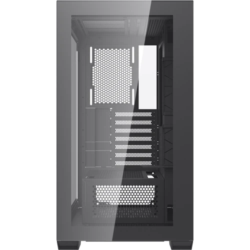 Передняя панель из закаленного стекла и двойная перфорация на боковой панели: Корпус имеет переднюю панель из закаленного стекла и двойную перфорацию на боковой панели, что обеспечивает отличную вентиляцию и оптимальную работу системы.
