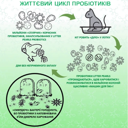 # Как работает Litter Pearls Probiotic? Принцип действия Litter Pearls Probiotic основывается на использовании специально подобранных пробиотических штаммов, находящихся в спорове в спящем состоянии. Эти споры активируются только в присутствии источника пищи, такого как, например, мочевина, содержащаяся в отходах кота.