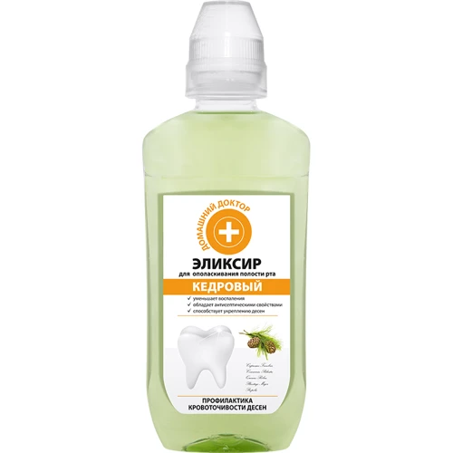 Для полноценного ухода за полостью рта недостаточно только зубной пасты и щетки. Также необходимо регулярно пользоваться эликсиром для ополаскивания полости рта ««Домашний Доктор»», который не только подарит свежее и чистое дыхание, но и гарантирует максимальную защиту от бактерий и кариеса. Активный комплекс, входящий в состав ополаскивателя, поможет также избавиться от воспаления десен, их кровоточивости. Регулярные ополаскивания способствуют укреплению зубной эмали, поэтому средство подходит и тем, у кого чувствительные зубы. Эликсир предотвращает развитие кариеса, также укрепляет зубы, после регулярного использования они менее поддаются воздействию бактерий и кислот. Благодаря алоэ вера вы сможете справиться с мелкими ранками в ротовой полости и предотвратить их появление. Состав эликсира дополнен активным кальцием из яичной скорлупы, который в сочетании с фтором, укрепляет зубную эмаль, способствует уменьшению развития кариеса, повышает устойчивость эмали к воздействию бактерий и кислот.