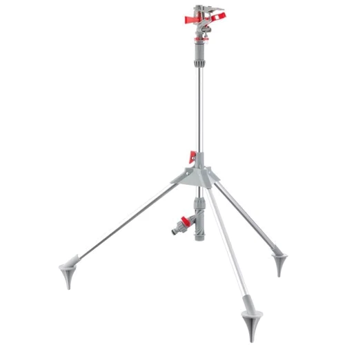 Дождеватель легко переносить с места на место и стационарно устанавливать на необходимом участке. Ножки имеют специальные клинья для надежной фиксации в земле. Массивная тренога-штатив обеспечивает полную устойчивость конструкции в мягкой земле, на сильном ветру и пр.