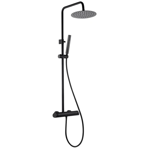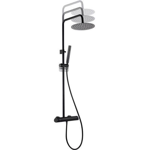 Душевой гарнитур Alpinia NAC N1QK от Deante комплектуется однорежимной прямоугольной ручной лейкой, круглым, однорежимным верхним душем диаметром 25 см, термостатическим смесителем для душа, душевой штангой с кронштейном высотой 110-130 см с регулируемым по высоте настенным держателем для ручной лейки, шлангом в полимерной оплетке длиной 150 см.
