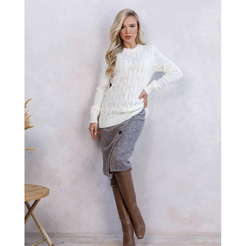 Теплый джемпер высокой эластичности прямого удлиненного кроя с манжетами. Модель ажурной комбинированной вязки с косами "Аран" оснащена длинными рукавами.