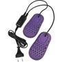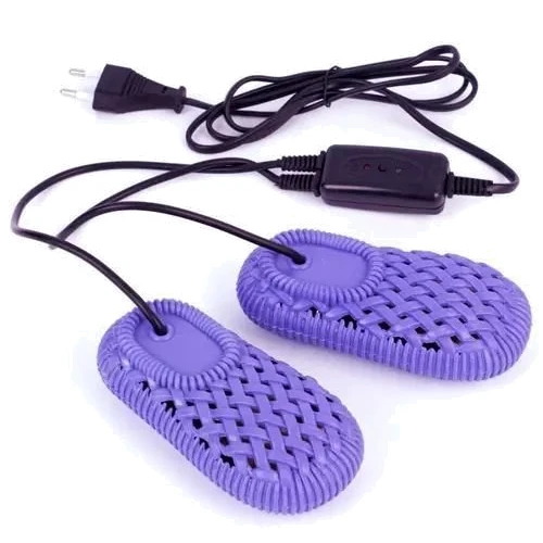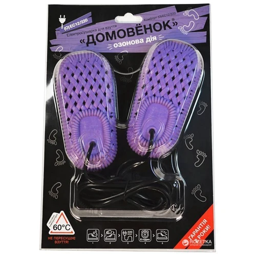 Электрическая сушилка для обуви представлена в виде двух фиолетовых тапочек (пластмассовых корпусов), в которых находятся нагревательные элементы, позволяющие высушить и обогреть мокрую обувь. Сушка надежной конструкции. Подходит для разных размеров и видов обуви. Главная особенность сушилки для обуви - озонирование, включается на 5 минут каждый час работы (на блоке управления загорается индикатор синего цвета). Озон убирает неприятные запахи и обеззараживает обувь, уничтожая грибок, споры и бактерии. Также прибор работает в щадящем режиме высыхания при оптимальной температуре в 60°C, которая не вредит обуви и продлевает срок ее эксплуатации.