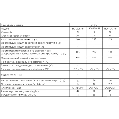 Модель ERGO BD-300 RF представляет собой вместительный и одновременно компактный морозильный сундук квадратного формата с верхним открыванием. Ее особенностью является то, что этот сундук можно переключить в режим холодильной камеры и использовать в качестве обычного холодильника. Данная модель отлично подойдет как для домашнего использования, так и для бизнес-потребностей: кафе, баров, небольших магазинов. К тому же, этот сундук может работать при наружной температуре в помещении до -15 градусов, что значительно расширяет варианты его использования.