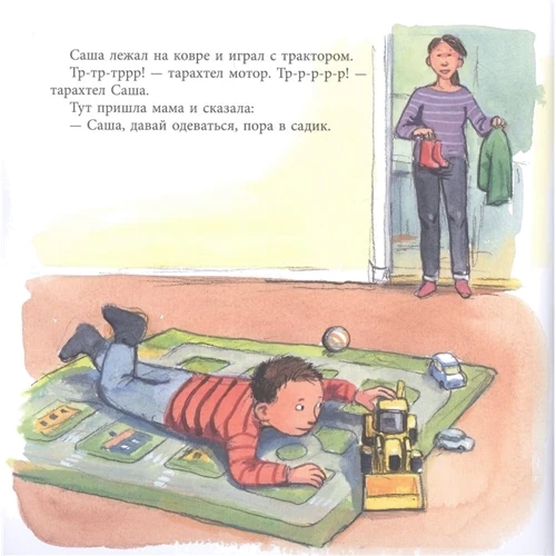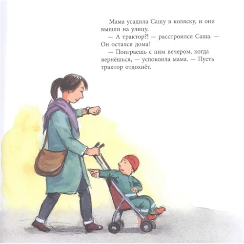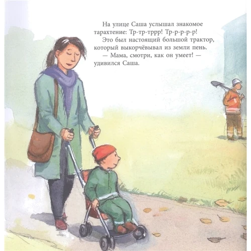 Саша забыл взять в детский сад свой игрушечный трактор. Он очень расстроился, но ненадолго, потому что по дороге в сад им с мамой посчастливилось увидеть настоящий трактор. А потом ещё и ещё — один другого интереснее: и трактор с погрузочным ковшом, и трактор с прицепом, и с подметальной щёткой, и с плугом, и даже с дровоколом.