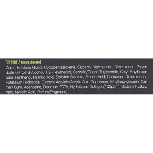 Water, Butylene Glycol, Cyclopentasiloxane, Glycerin, Niacinamide, Dimethicone, Polysorbate 60, Cetyl Alcohol, 1,2-Hexanediol, Caprylic/Capric Triglyceride, Cetyl Ethylhexanoate, Panthenol, Palmitic Acid, Sorbitan Stearate, Stearic Acid, Carbomer, Dimethiconol, Potassium Hydroxide, Glyceryl Acrylate/Acrylic Acid Copolymer, Ethylhexylglycerin, Xanthan Gum, Adenosine, Disodium EDTA, Hydrolyzed Collagen, Sodium Hyaluronate, Myristic Acid, Parfum (Fragrance).