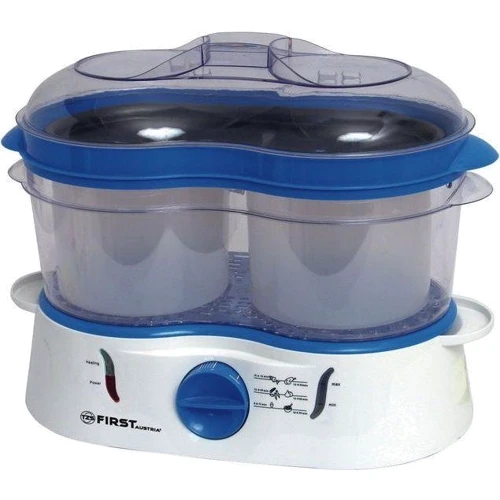 Пароварка FIRST FA-5101. Довольно непривычный в чем-то даже футуристический вид этого устройства для приготовления пищи преобразит вашу кухню. Две паровых корзины этой модели расположены на одном уровне, а не одна над другой как принято у большинства пароварок. Общий объем корзин составляет 5,7 литров, а выполнены они из прозрачного пластика. Управляется пароварка поворотным переключателем.