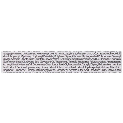 Water, Propolis Extract, Isopropyl Myristate, Ethylhexyl Palmitate, Butylene Glycol, Glycerin, Hydrogenated Polydecene, Cetearyl Olivate, Sorbitan Olivate, Rosa Centifolia Flower Water, 1,2-Hexanediol, Bixa Orellana Seed Oil, Helianthus Annuus (Sunflower) Seed Oil, Glycine Soja (Soybean) Oil, Tocopherol, Tremella Fuciformis Polysaccharide, Ammonium Acryloyldimethyltaurate/VP Copolymer, Citrus Junos Seed Oil, Propanediol, Caprylyl Glycol, Illicium Verum (Anise) Fruit Extract, Sodium Hyaluronate, Honey Extract, Citrus Junos Fruit Extract, Hydroxyethylcellulose, Allantoin, Fragrance, Limonene, Linalool, Ethylhexylglycerin, Tocopheryl Acetate, Citric Acid, Disodium EDTA