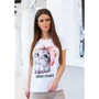Белая футболка из хлопкового трикотажа средней эластичности. Модель прямого кроя с полукруглой неглубокой горловиной и короткими рукавами. Передняя часть декорирована ярким крупным принтом.