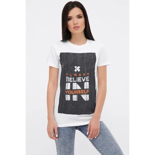 Летняя женская футболка. У футболки классический фасон с короткими рукавами и круглым вырезом горловины. Модель сшита из хлопковой ткани.