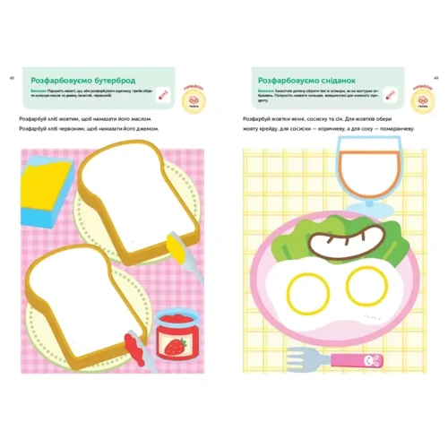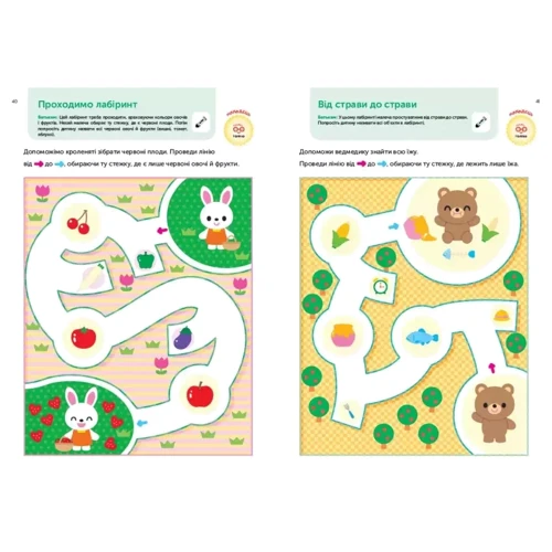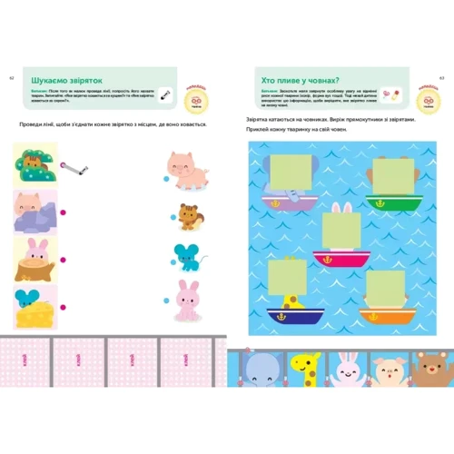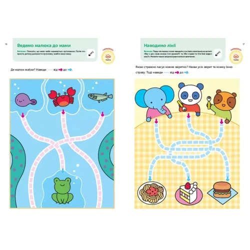 Коли дитина виконає вправу, можна поговорити з нею про те, що зображено на сторінці. Маля може показати й назвати тварин, об’єкти та кольори. Поміркуйте разом, які предмети на ілюстрації більші, а які менші. Або порахуйте зображені об’єкти. Кожне завдання ретельно розроблене таким чином, щоб розвивати конкретні навички. Проте малюку також дуже корисно буде поговорити з вами про картинки, які він бачить.