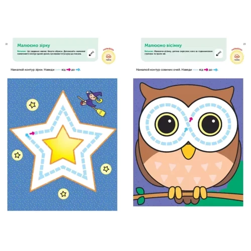 Книжка розвиває базові навички малюка віком від двох до чотирьох років. Тут дитина вчиться наводити лінії та обводити контури, проходити лабіринти, малювати та розфарбовувати ілюстрації, знаходити логічні пари.