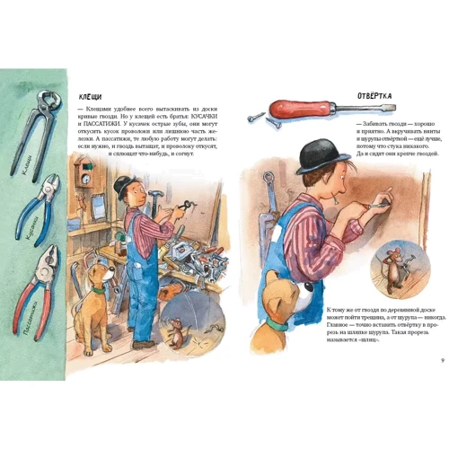 Теперь у читателей появилась возможность побывать в святая святых - столярной мастерской Мулле Мека. Мулле как раз наводит в ней порядок, развешивает над верстаком инструменты, раскладывает по коробочкам шурупы и гвозди, а заодно рассказывает читателям о том, какой инструмент как называется, для чего нужен и как устроен. Каков принцип работы рычага и клина, что такое шлиц и гарда, для чего нужен ватерпас - обо всём этом можно узнать из книги "Мулле Мек в мастерской".