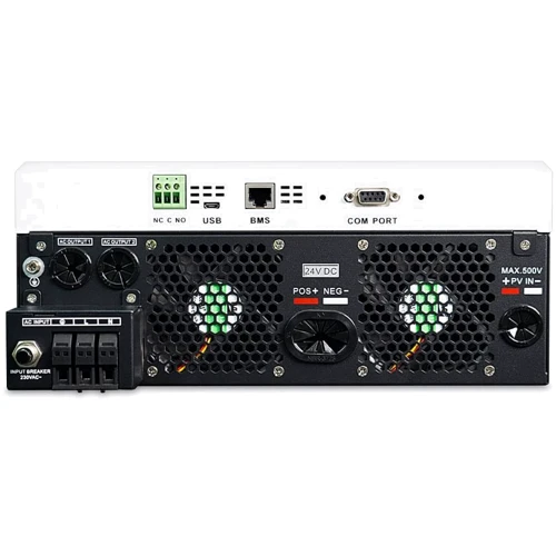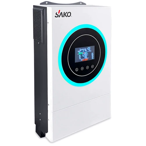Гибридный однофазный инвертор Sako SUNON V 4.5KVA/4200W/24V+120A MPPT с максимальной мощностью 4.5 кВА/4.2 кВт (максимальная кратковременная мощность 8.4 кВА), встроенный MPPT-контроллер и зарядное устройство. Имеет правильную синусоиду на выходе 220 В. Диапазон входного напряжения 90-280 В, от солнечных панелей 60-450 В. Максимальный ток заряда 120 А. Напряжение аккумуляторной системы 24 В. Поддержка подключения аккумуляторных батарей типа AGM/GEL/LiFePo4/Li-ion. Выходное напряжение 230 В ±5%. Интерфейсы RS485, CAN, RS232, USB, сухие контакты, встроенный локальный WiFi – только для удаленного мониторинга с мобильного приложения. Возможность работы без подключения аккумуляторных батарей. Сенсорный ЖК-дисплей. Может подключаться к генератору.