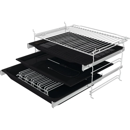 Дверца с четверными стеклами и двумя термоотражающими слоями, частично выдвижные двухуровневые телескопические направляющие. Глубокий эмалированный противень, эмалированный противень с перфорацией, мелкий эмалированный противень, решетка.