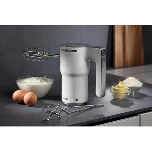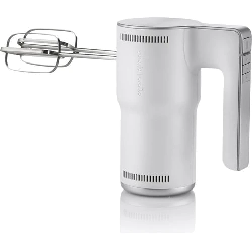 Миксер удобно держать в руке благодаря широкой и ухватистой ручке. Управлять работой прибора просто – кнопки переключения скоростей расположены на ручке. Погружные венчики выполнены из нержавеющего прочного металла, отсоединяются одним нажатием кнопки. Выбор из 5 рабочих режимов позволяет получить любую консистенцию – смешать вязкое тесто, взбить суфле и прочее. Миксер оснащен двигателем 400 Вт с высоким рабочим ресурсом, это одна из лучших бытовых моделей с длительным сроком эксплуатации. Стильный лаконичный дизайн делает прибор украшением и надежным помощником на кухне.