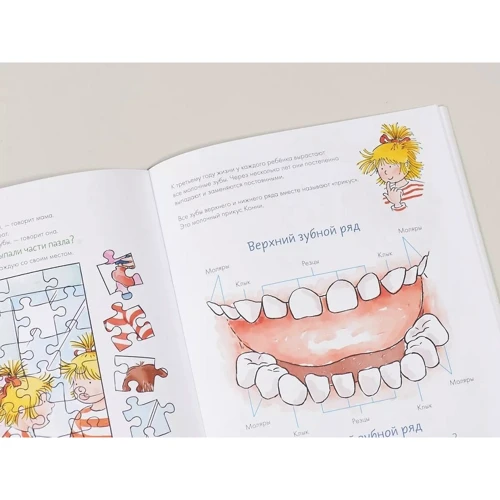 Внутри вы найдете полезные советы и интересные факты, викторины и лабиринты, игру-бродилку и инструкцию, как сделать коробочку для молочных зубов. Берегите зубы и учитесь чистить их правильно вместе с любимой героиней!