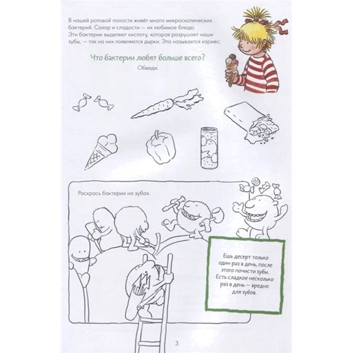 «В нашей ротовой полости живёт много микроскопических бактерий. Сахар и сладости — их любимое блюдо. Эти бактерии выделяют кислоту, которая разрушает наши зубы, — так на них появляются дырки. Это называется кариес».