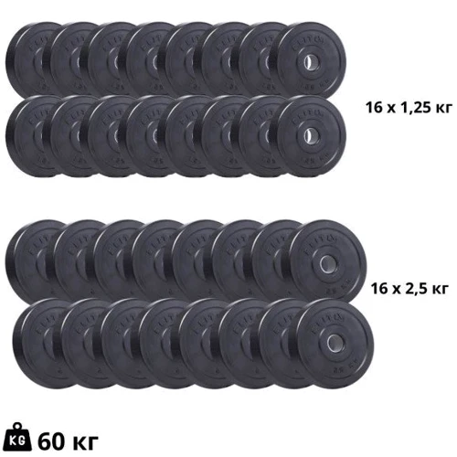 Набор Elitum 60 кг - это универсальный спортивный снаряд для полноценных силовых тренировок в домашних условиях. Состав набора подобран с учетом рекомендаций профессионального тренера как оптимальное сочетание необходимого веса и количества дисков. Набор позволяет наилучшим образом тренировать все необходимые группы мышц и дать им максимально эффективную нагрузку. С набором Elitum вы сможете улучшить физическую форму и состояние здоровья, нарастить мышечную массу, повысить выносливость и укрепить сердечно-сосудистую систему. Набор состоит из дисков, покрытых ABS-пластиком. Высокое качество изготовления и долговечность деталей гарантирует, что ваши тренировки по данному набору будут проходить комфортно, безопасно и с максимальной пользой.