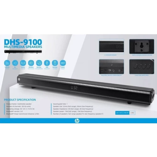 Саундбар DHS-9100 от компании HP. Принадлежит к категории 3 саундбаров, Беспроводное соединение Bluetooth позволяет подключать устройства, имеющие такую же технологию, например, мобильный телефон. К порту AUX можно подключить любое другое устройство с помощью 3,5-мм кабеля и, по сути, использовать саундбар в качестве колонки.