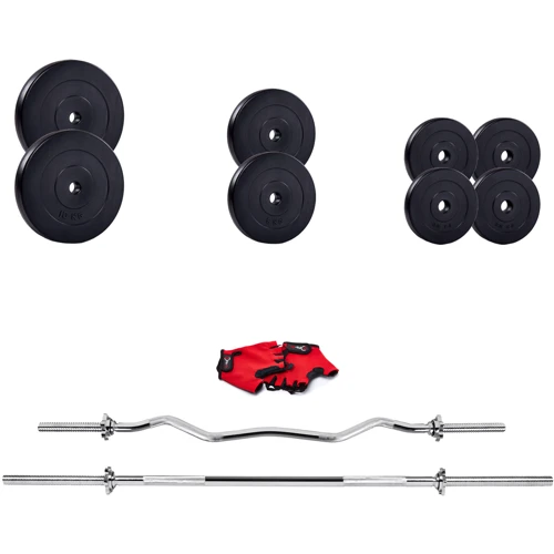В комплект входит гриф прямой длиной 180 см с диаметром 30 мм, гриф W-образный 1,2 метра такого же диаметра и весом 8 кг., перчатки и диски. Общий вес составляет 58 кг.