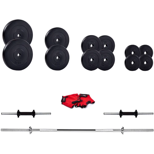 В комплект входит гриф прямой длиной 180 см с диаметром 30 мм, 2 гантельных грифа, перчатки и диски. Общий вес составляет 57 кг.