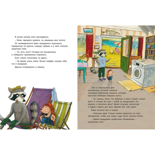 Хорошо, когда задумаешь что-то важное и полезное, только надо умело взяться за дело. А если дело всё-таки не ладится, на помощь приходят смекалка и фантазия. Два друга, енот и ёжик, сами убедились в этом, когда решили помочь своим лесным соседям.
