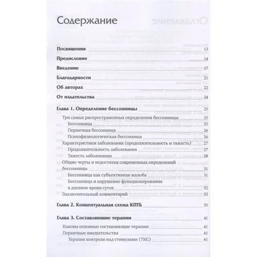 Данное руководство состоит из семи разделов: определение бессонницы, краткий обзор концептуальной схемы лечения, общий обзор составляющих терапии, посеансовое руководство, диалоги психотерапевта с пациентами, оценивание и пригодность пациентов для КПТБ и типовая документация. Организационные принципы данного руководства определяются следующими, на первый взгляд, простыми вопросами: "Кто подходит для КПТ?" и "Что нужно знать, чтобы организовать службу поведенческой медицины сна, готовую предоставлять эмпирически выверенное лечение на основе данных и с предоставлением данных?" Читатель найдет в данном руководстве все, что требуется для уверенного ответа на эти вопросы.